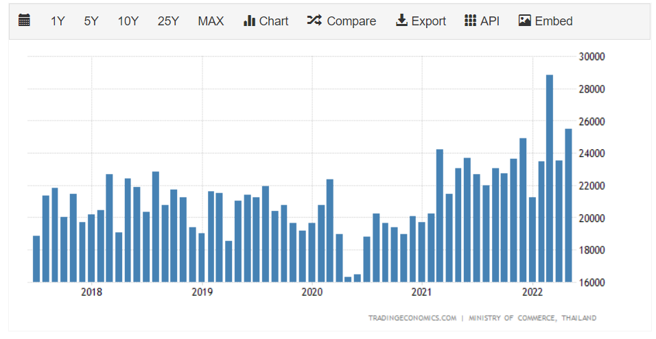 Thailand’s economy is largely based on exports. Foreign trade volume was realized as 536.5 billion dollars in 2021, 267.4 billion dollars of which were exports, and 269.1 billion dollars were imports. About 80% of exports are made up of industrial products.