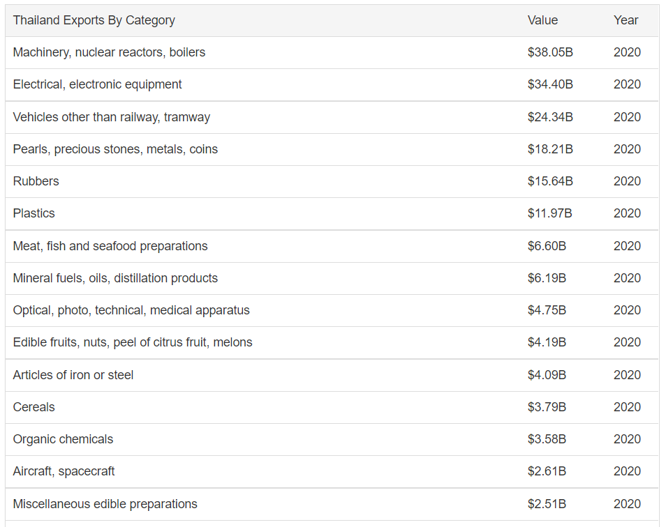 Thailand’s top exports are machinery with a share of 38%, mechanical appliances (44.8 billion USD), Electrical machinery and equipment with 19% (40.1 billion USD), and iron and steel with 9% (31). 0.7 billion USD). Although 80% of its exports are based on industrial products, Thailand has a high potential for agricultural and livestock products.